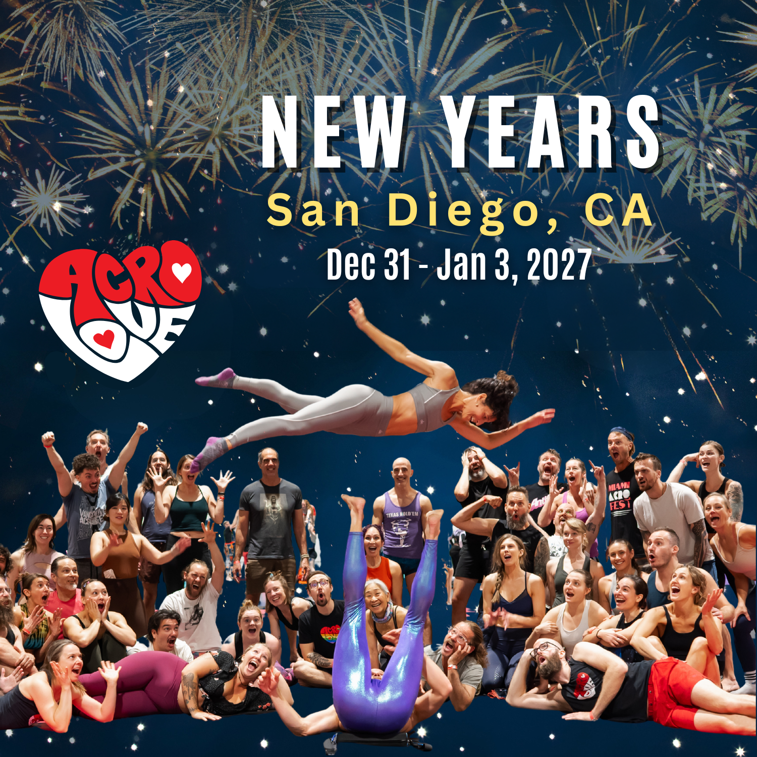 Kick things off with an epic New Year’s Eve acro party on Thursday night, then dive into a full weekend of festival classes from Friday through Sunday!